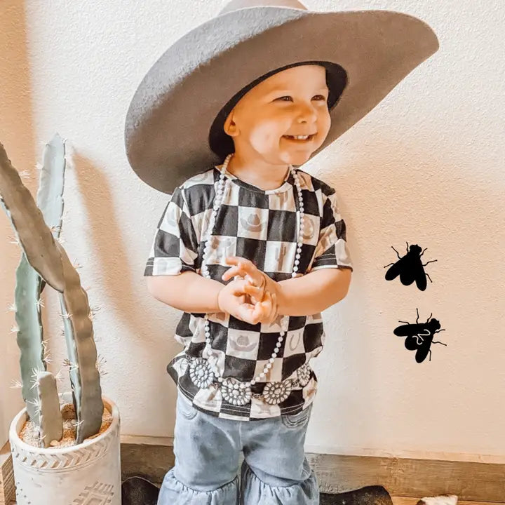 CHECK IT... your favorite t-shirts are back but with this western check shirt is comfy. comfy. comfy. western check shirt. kids material t-shirts. lots of stretch. model is a 1T wearing it oversized in a 2T.