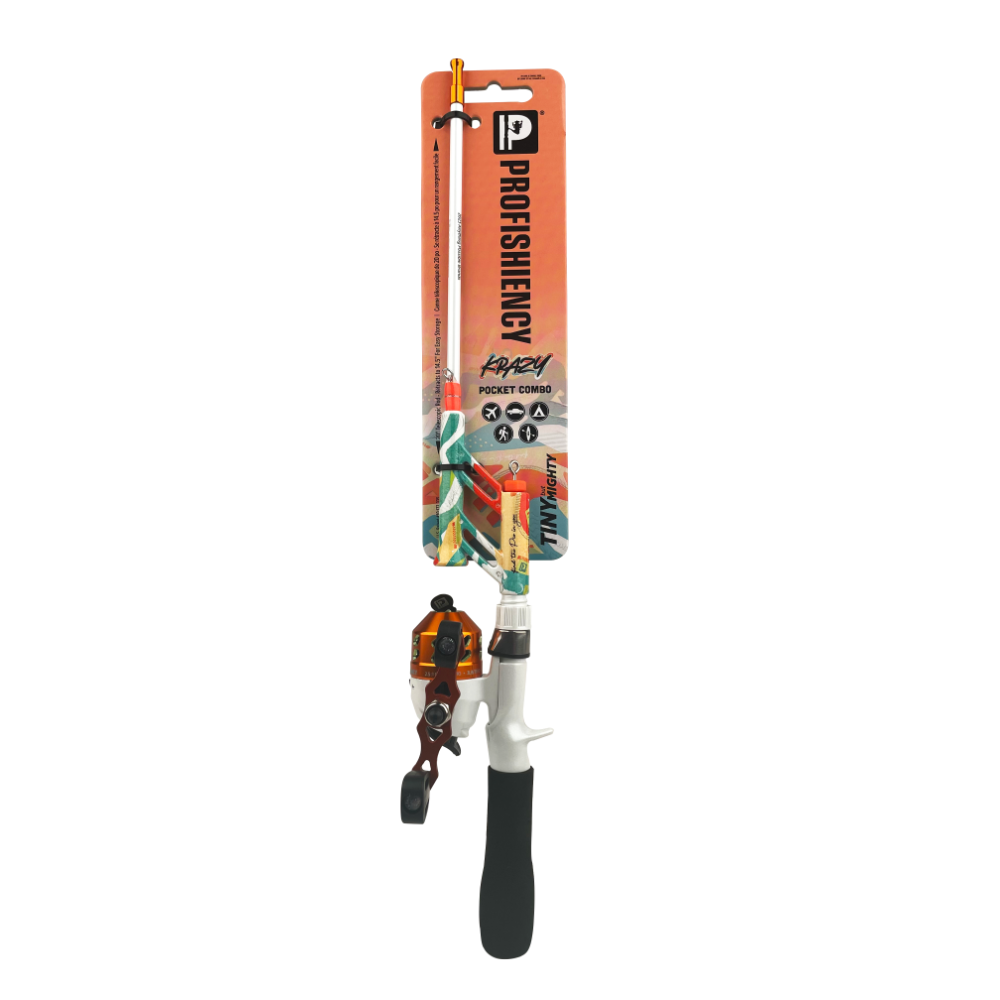 The Profishiency Tiny Krazy Spincast Combo delivers big fun in a compact size! It features a 20” Inline Tangle-FREE Telescopic fiberglass rod that retracts to 14.5″ for easy storage, along with a smooth 2.5:1 gear ratio Micro Spincast Reel and pre-spooled 3lb line, making it ready for action straight out of the box.